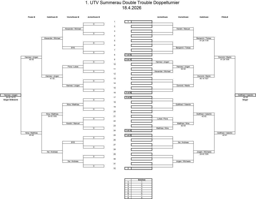 Am Samstag den 18. April 2026 fand erstmals unser vereinsinternes „Double Trouble“ Doppelturnier statt. Insgesamt gingen 10 Doppelpaare an den Start und sorgten bei herrlichem Wetter für einen rundum gelungenen Turniertag.